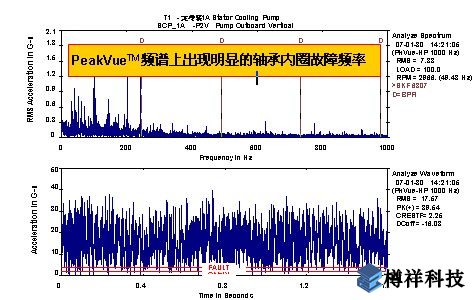 電機(jī)頻率為2950r/min(49.13hz),電機(jī)端軸承型號(hào)為skf6313,定冷泵端軸承型號(hào)為skf6307。采用加速度傳感器分別測(cè)量?jī)蓚€(gè)軸承的軸承座外殼水平、垂直和軸向方向的振動(dòng)量。測(cè)點(diǎn)位置如圖5所示。在進(jìn)行普通的波形頻譜分析的同時(shí),還利用了csi的***技術(shù)peakvuetm 對(duì)軸承進(jìn)行狀態(tài)監(jiān)測(cè)。