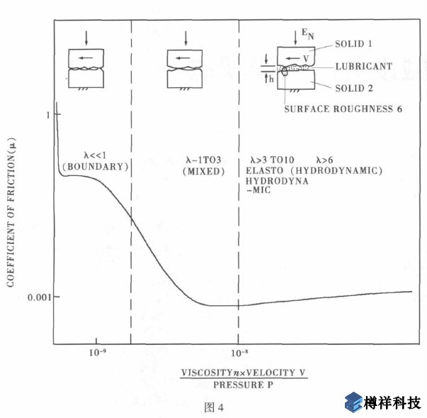 如前所述,Streibeck 曲線(xiàn)的建立是以滑動(dòng)軸承為基礎(chǔ)的,其橫坐標(biāo)采用滑動(dòng)軸承特性數(shù)Zn/p 是很合理的選擇(其意義與Sommerfield 數(shù)ηω/p 相同)。但是隨著摩擦學(xué)的發(fā)展,研究對(duì)象日益豐富和多樣化,僅用這個(gè)參數(shù)來(lái)表示摩擦副表面間的隔離程度是具有局限性的。美***的Hamrock 教授提出, 為使Streibeck 曲線(xiàn)更具普遍性,將橫坐標(biāo)改為油膜厚度與表面粗糙度之比(比膜厚Specific Film Thickness)λ。