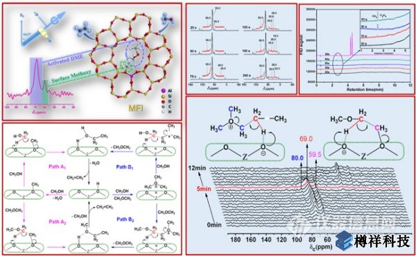 本項工作中,研究人員通過在線監(jiān)測***初始反應階段,推測初始烯烴來源于催化劑表面C1吸附物種的直接轉(zhuǎn)化;隨后通過催化劑液氮淬冷和固體核磁表征,確定了催化劑上***初始反應階段存在的表面C1吸附物種(甲醇和二甲醚)和C1活性物種(表面甲氧基和三甲基氧鎓離子);進一步通過原位固體核磁研究,在真實甲醇轉(zhuǎn)化反應條件下,成功捕捉到二甲醚C-H鍵活化后生成的類亞甲氧基(methyleneoxy analogue)物種,由此獲取了C1物種活化生成***個C-C鍵的直接證據(jù);在此基礎上提出了初始烯烴生成的反應路徑—表面甲氧基/三甲基氧鎓離子協(xié)助甲醇/二甲醚活化轉(zhuǎn)化的協(xié)同反應機理。