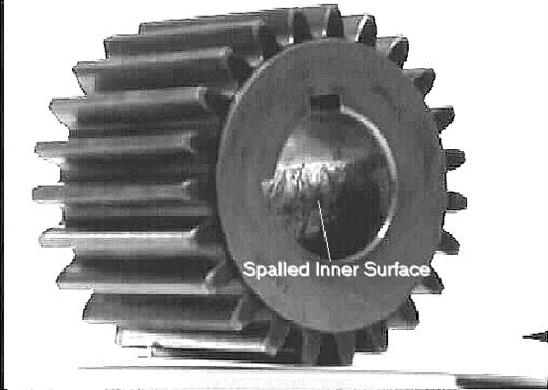 圖5.該照片顯示了齒輪在軸上來回轉(zhuǎn)動引起的小齒輪孔剝落。